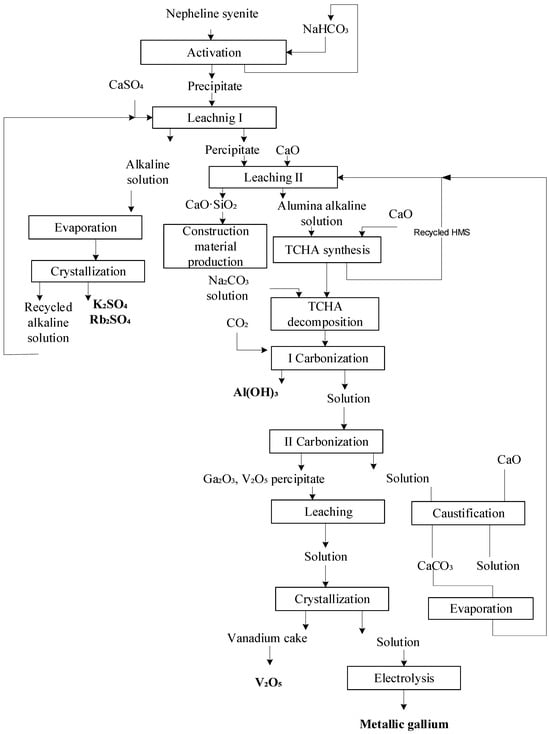 In this study, a complex hydrochemical alkaline sulfate technology involving nepheline processing with the associated extraction of gallium and vanadium was developed. This technology allows for the wasteless utilization of nepheline to produce aluminum hydroxide, soda, potash, potassium sulfate, construction materials, gallium, and vanadium without polluting the environment. The proposed technology includes the activation of raw materials, followed by a two-stage leaching process using an active calcium reagent, where potassium and rubidium are extracted in the first stage. Approximately 90% of Rb2O is extracted into the solution as a result of the first stage of the leaching process. The sludge and solution obtained from the second stage of the leaching process are utilized for calcium silicate production and two-stage carbonization, respectively. Aluminum hydroxide is extracted during the first stage, and a concentration of rare metals such as gallium and vanadium is obtained at the second stage. Vanadium is extracted from the solution via crystallization, and gallium is extracted via electrodeposition. In total, 38.487% of the Ga2O3 and 56.124% of the V2O5 are extracted from nepheline syenite.