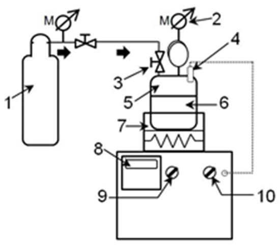 Schematic diagram of subcritical water reactor: (1) gas cylinder; (2) manometer; (3) input gas valve; (4) thermocouple for temperature measurement; (5) coverlid of the reactor; (6) reaction vessel; (7) vibrating platform; (8) digital temperature controller; (9) main switch; (10) switch for the vibrating platform.