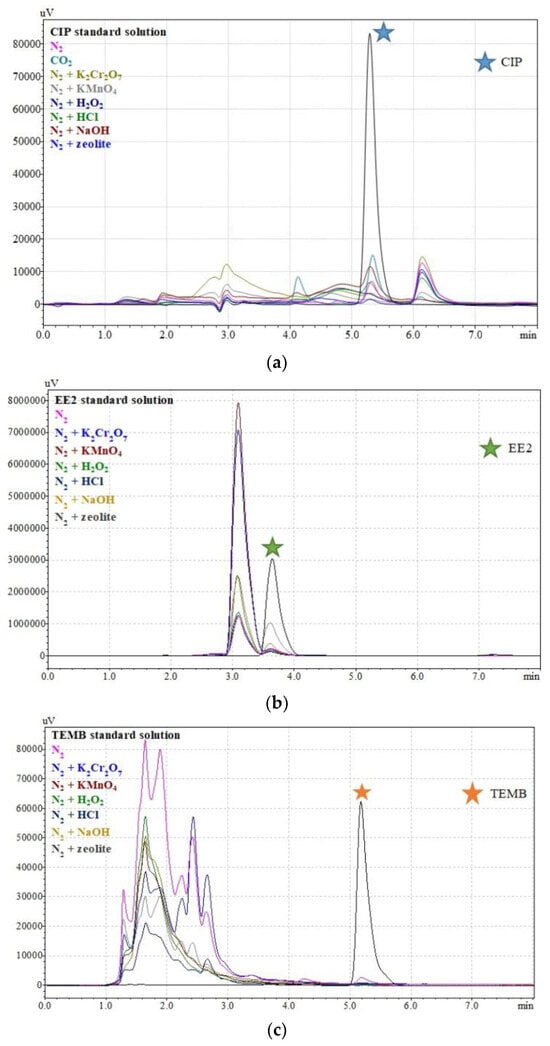 Chromatograms portraying the removal efficiency of pharmaceuticals: (a) CIP, (b) EE2, and pesticide: (c) TEMB after 60 min of subcritical water treatment using different catalysts and atmospheres, compared with selected aqueous solutions of pollutant standards (0.05 mmol/L).