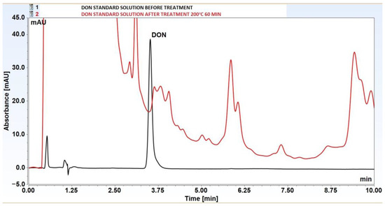 Chromatogram portraying the removal efficiency of mycotoxin DON after 60 min of subcritical water treatment at 200 °C compared with selected aqueous solutions of pollutant standard (1.687 μmol/L).