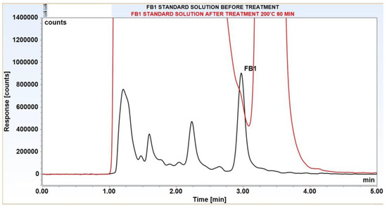 Chromatograms portraying the removal efficiency of mycotoxin FB1 after 60 min of subcritical water treatment at 200 °C compared with selected aqueous solutions of pollutant standard (1.390 μmol/L).