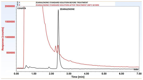 At 200 °C, the degradation of DON and FB1 was complete, even at shorter treatment times (60 min) (Figure 3 and Figure 4), while 90% of zearalenone was degraded within the same treatment time (Figure 5). Further improvement of the efficiency of zearalenone degradation was assessed through varying two parameters, i.e., temperature and time. Moderate prolongation of the treatment time to 100 min already yielded zearalenone degradation in full, as did the temperature increase for 30 °C, maintaining shorter treatment times of 60 min.