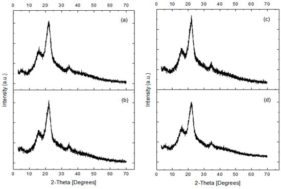 By X-ray diffraction analysis, peaks were observed at 5, 16, 22, and 35°. The highest intensity peak was at 22°, which was observed in all samples. In Figure 1a,b, the peaks at 5 and 16° present little definition compared to the signal for these values in Figure 1c,d. The signal of the diffractograms is observed with greater noise after having carried out the interaction of the biosorbent with the multi-elemental solution. However, no substantial changes were observed, such as the appearance of new peaks or the absence of these, which could be attributed to the concentrations used. The identification of the phases in the sample allowed assigning the signals of cellulose (16°, 22°, and 35°) [] and silica (22°) []; it could even be attributed to a 22° overlap, this being a reported peak for both compounds.