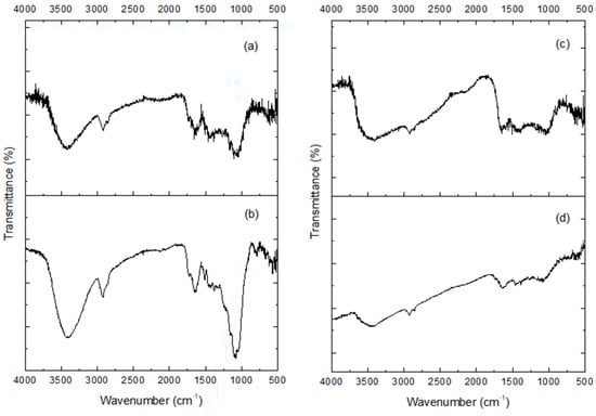 Figure 2a,b show the FTIR analysis for the shell without treatment; the signal was observed at 3400 cm−1, which has been reported for the stretching of the hydroxyl groups on the surface []. Likewise, the signal found at 2900 cm−1 is attributed to CH3 and CH2 coming from aliphatic compounds, and in the range of 1600–1400 cm−1, they have been reported as C-H signals coming from aromatic rings []. Another of the signals with the highest intensity was recorded at 1050 cm−1, which can be assigned together with the signal at 805 cm−1 to stretching vibrations for symmetrical and asymmetrical Si-O groups []; furthermore, these vibrations confirm the presence of silanol (Si-OH) and siloxanes groups (Si–O–Si–OH) [,,]. It was also possible to observe the elongation of the signal in the range of 1500 and 1250 cm−1 in Figure 2a, concerning the control (Figure 2b). The signal at 1000 cm−1 has been attributed to the presence of C-O (stretch) groups present in ester groups []. However, due to the observed intensity of the peak at ~1000 cm−1, it could be due to an overlap of signals for Si-O and C-O [].
