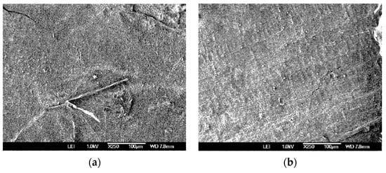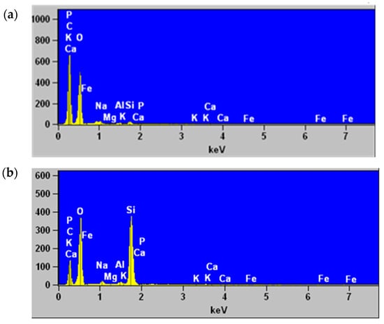 The SEM analyses allowed us to observe the morphology of the surface of the adsorbent without treatment with NaOH, before and after the adsorption process with metals. In Figure 3a, an irregular surface was observed, with apparent roughness resulting from the grooves and cracks in the material, which may favor the exposure of binding sites for metal adsorption []. Likewise, in Figure 3b, folds were observed, causing roughness in the area analyzed. In the elemental analysis of the adsorbents (Figure 4), the decrease in the signal of elements such as P, C, K, and Ca was observed after the adsorption process, while in elements such as Fe and O, the signal increased. Even in the shell analyzed after adsorption, the signal corresponding to Cu (Lα 0.930) was observed. The increase in Fe and Cu signals can be attributed to their affinity for the active sites present in the adsorbent.