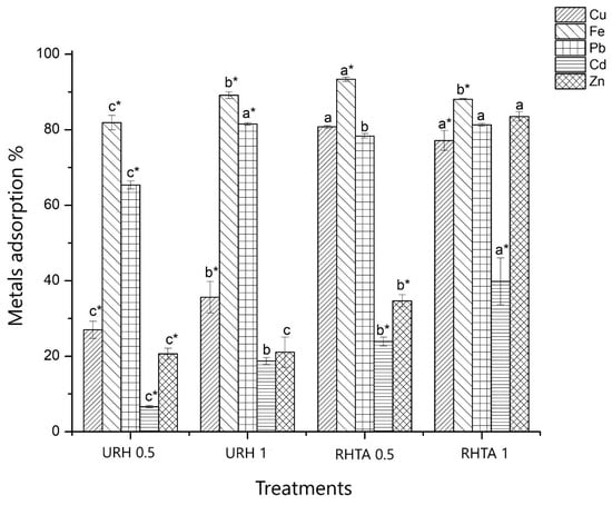 Figure 7 shows the treatments used to remove the metals: Cu(II), Fe(II), Pb(II), Cd(II), and Zn(II). The adsorbent presented higher adsorption of Fe, followed by Pb, Zn, Cu, and Cd, respectively. On the other hand, it is important to point out that the metals, when found in a mixture, are not absorbed in the same proportion since there is competition between the available sites of the rice husk, which when joining the functional groups of the biosorbent and some sites are more related to certain metal ions [].