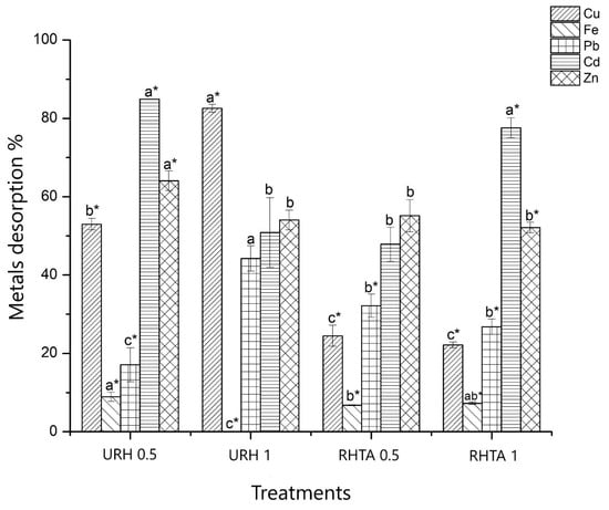 It is important to point out that it is possible to obtain the adsorption equilibrium by fitting the experimental data to the Freundlich model, which indicates that the rice husk adsorbed the heavy metals in the form of a multilayer. In addition, those data were adjusted to the pseudo-second-order kinetics, which indicates that the most important phase is the adsorption process, which depends to a greater extent on the active sites found on the surface of the rice hulls in which metal ions might be interacted. For these reasons, it is considered that the RHTA could be a viable option for Cd and Zn removal from contaminated water with a mixture of other heavy metals, with a further recovery of those heavy metals. In addition, it was found that a high Fe and Pb removal was feasible, with a relatively low metal desorption.