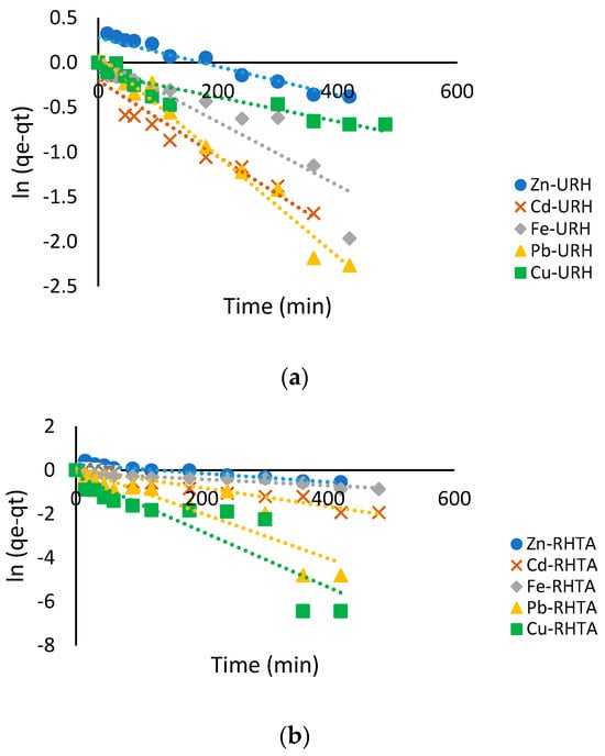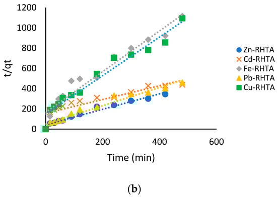 For this, the pseudo-first-order and pseudo-second-order models were used []. The linearized model equations used are shown in Equations (5) and (6).