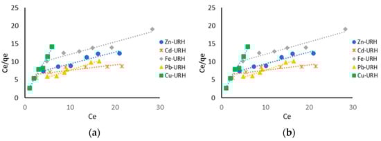 To carry out the isotherms, the URH1 and RHTA1 treatments were used, as well as 6 different concentrations of the metals Cu, Fe, Pb, Cd, and Zn (5, 10, 15, 20, 25, 30 mg/L), where they were added 180 mL of the mixed metal solution in 250 mL flasks to shake at 120 rpm at 28 °C and then take samples for 8 h; this was determined through adsorption kinetics.