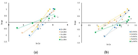 Langmuir and Freundlich’s isotherms are represented in Equations (7) and (8), respectively.