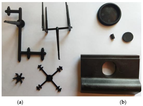 The post-production waste comes from cold runner systems that remained after the injection process was grounded using a low-speed granulator, Rapid Power Tech 150, (Rapid Granulator, Bredaryd, Sweden) with a 4 mm sieve. The arrangement of knives used to maintain a constant distance between the sieve and the housing allows for obtaining grinding with properties similar to those of the original raw material. The regrind obtained during the process was used to manufacture new products. Examples of various types of post-production residues in the form of cold runner injection molding systems and polyamide products are shown in Figure 1. The original polyamide pellets and grinding from cold runner systems are shown in Figure 2.