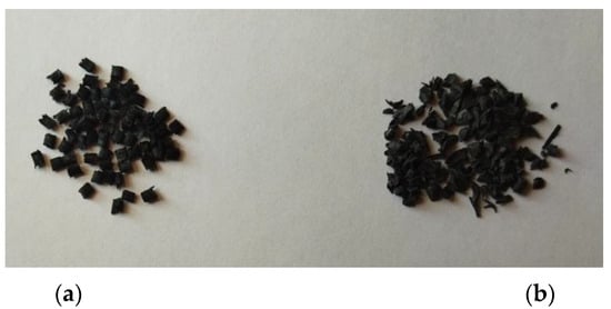 (a) The original polyamide pellets and (b) the grinding from cold runner systems.