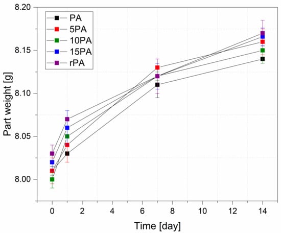 Samples containing 0, 5, 10, 15, and 100% of regrind were produced and described as PA, 5PA, 10PA, 15PA, and rPA. The samples were conditioned for 24 h and 14 days in distilled water and in a BINDER constant climate chamber (70 °C, 62% RH) until the constant mass was obtained. Figure 3 shows the increase in mass of samples conditioned in water. After 14 days, the sample mass increased on average by 2%. Moreover, the samples were aged in a TestAn Xentest 2200 xenon light (TestAn, Gdańsk, Poland) accelerated aging chamber for 168 h (7 days) under 0.55 W/m2 irradiance at 340 nm UV light intensity.