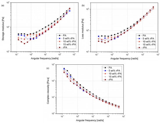 The rheological behavior of polyamide composites containing various amounts of recycled fraction was analyzed using an Anton Paar MCR 301 (Anton Paar, Graz, Austria) oscillatory rheometer equipped with 25 mm diameter parallel plates and a 1 mm gap. The measurements were conducted at 275 °C. Preliminary tests were performed using the strain sweep mode to ensure later experiments were located in the linear viscoelastic (LVE) region. Angular frequency sweeps were performed at 0.05% strain in the LVE region, in the 0.15 to 500 rad/s range.