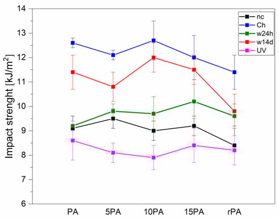 The impact strength (ak) of the samples: not conditioned (nc), conditioned in the chamber (Ch), conditioned in the water for 24 h (w24h), for 14 days (w14d), and in the UV aging chamber (UV).