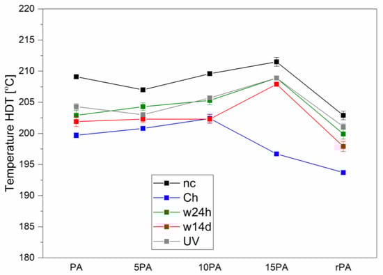 The heat deformation temperature (HDT) determines the resistance of the polymer to changes under a given load at an elevated temperature. The measurement allows for determining the change in material stiffness with increasing temperature and assessing the finished product’s operating temperature range. The HDT average values are presented in Table 7. There is a 5% decrease in the temperature at which the samples deform as the parts saturate with water. Adding up to 15% of the regrind to the virgin material has a negligible influence on the HDT values. The samples produced using 100% regrind exhibit significantly lower temperature values (Figure 7). This effect may be caused by glass fiber shortened during milling and, thus, the lower stiffness and increased mobility of the polymer chains [].