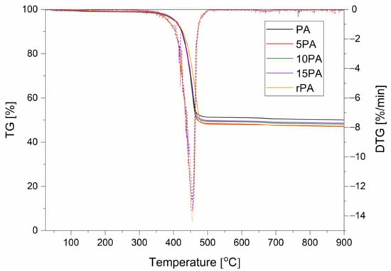 Data on the degradation characteristics of polyamide materials, such as the mass loss temperatures of 5% and 10% (T5% and T10%), maximum intensity of thermal degradation temperatures (DTG), and residual mass, are listed in Table 8. The characteristic curves of the TG and DTG are presented in Figure 8. These results confirmed that the addition of waste polyamide does not negatively affect the thermal stability of the materials. The T5% value for all of the tested materials was similar and amounted to an average of 403 °C, and the residual mass was about 48%. High amounts of burnout residue were noticed, which indicates the presence of an inorganic phase. For all of the tested polyamide samples, a single-stage decomposition was observed, which is confirmed by the visible characteristic DTG peak at a temperature of 456 °C (Table 8).