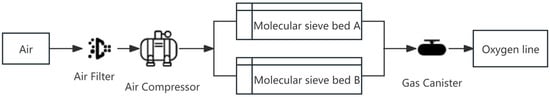 Oxygen is an essential life element for the human body, while oxygen is necessary for our survival []. Normally, the oxygen content in the air is about 21%, and the human body is able to live normally within an oxygen concentration range of 19.5% to 23.5% []. However, when the oxygen concentration exceeds this range, becoming either too low or too high, it may pose some risk to human and production safety. The human body may experience a variety of symptoms when exposed to thin air or oxygen-deprived environments. When an aircraft is in flight, the atmospheric pressure gradually decreases as the altitude rises, resulting in a decrease in the partial pressure of the oxygen in the indoor and outdoor air, and members of an onboard crew may not be able to obtain sufficient oxygen to meet their physiological needs []. Similarly, hypoxia may occur in highland areas because of increasing altitude, decreasing atmospheric pressure, and decreasing partial pressure of oxygen in indoor and outdoor air. In addition, closed environments have restricted gas flows and relatively low oxygen levels, increasing the risk of hypoxia. Oxygen deprivation can cause damage to the functioning of various body systems, and in serious cases can even endanger life, so effective measures must be taken to protect health []. In such cases, supplemental oxygen is the best treatment, so the cost-effective separation of high-purity oxygen from air is critical to the oxygen industry. At present, oxygen production is divided into physical and chemical methods, but chemical methods have certain safety hazards. Therefore, the development of oxygen technology tends to be more towards physical methods, of which the most commonly used is air separation technology []. At home and abroad, a variety of air separation oxygen production processes have been developed, such as low-temperature deep-cooling oxygen production, membrane separation oxygen production, pressure swing absorption oxygen production, and coupled air separation oxygen production. Among them, pressure swing adsorption (PSA) oxygen generation has the following advantages over other oxygen generation methods: 1. Low energy consumption. PSA oxygen production is generally operated at room temperature, which can save energy consumption for heating or cooling, the main energy consumption in the compressor. 2. The process is simple and can be fully automated. 3. The oxygen concentration produced is high. The PSA oxygen production process can make the oxygen concentration as high as 90%, and the oxygen concentration can be adjusted.