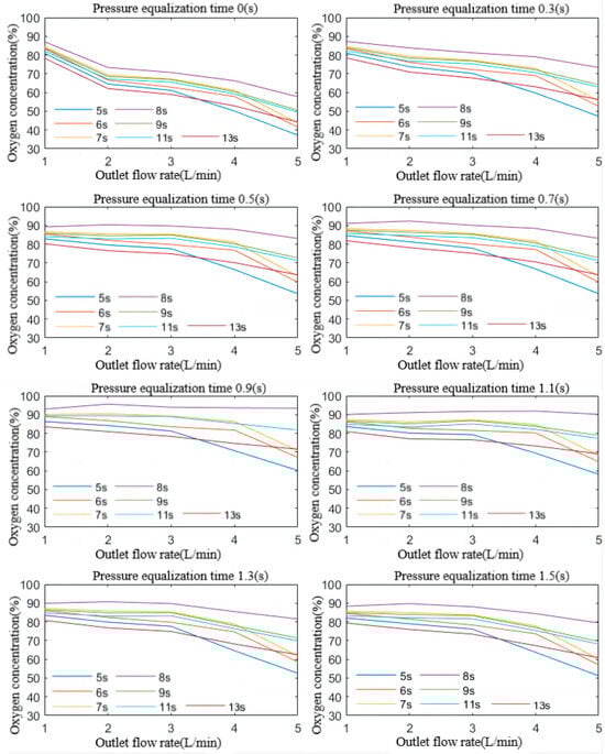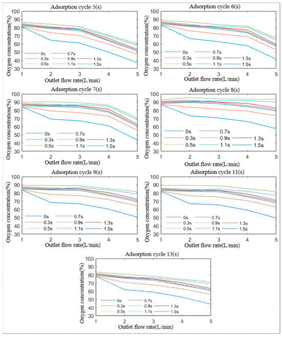 The adsorption step is a critical phase in the PSA oxygen generation process []. During this phase, the pressure inside the adsorption tower increases as feed air enters. Simultaneously, the molecular sieve adsorbs and separates the feed air components, resulting in the discharge of oxygen-enriched product gas from the air outlet. Once the pressurised adsorption step is completed, the feed air is switched to another adsorption tower to continue the cycle. In the experiment, the adsorption cycle on the experimental platform was systematically adjusted. The effects of different pressure equalisation times and outlet flow rates on the oxygen concentration were investigated. Figure 3 illustrates the variation curve of the adsorption cycle’s impact on the oxygen concentration.