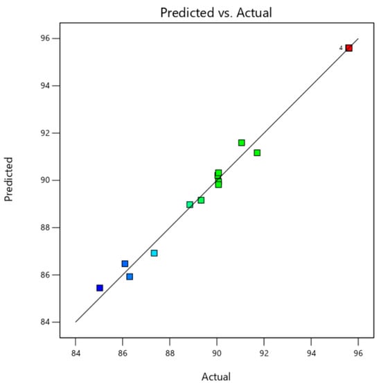 As can be seen in Table 2, the partial regression coefficients of the primary terms are highly significant for X1 and X2 and significant for X3. This indicates that the adsorption period, pressure equalisation time, and outlet flow rate have a significant effect on the oxygen concentration. In the crossover term, the p-values of X1X2, X1X3, and X2X3 are all less than 0.05, demonstrating that the interaction among these variables significantly affects the oxygen concentration. The absolute values of the coefficients for X1X2, X1X3, and X2X3 in the fitting equation are 0.005, 0.085, and 0.655, respectively. It is evident that the interaction between the equalisation time and outlet flow rate has the greatest effect on the oxygen concentration, while the interaction between the adsorption period and outlet flow rate has the least effect. The adjusted R2adj and R2 values for oxygen concentration are 0.9807 and 0.9915, respectively, which are very close to each other. This indicates that the regression equations are well-fitted to the actual data. As shown in the plot of the predicted values of the regression model versus the experimental measurements (shown in Figure 5), the distribution of the experimental values and predicted values is close to a straight line. This demonstrates that the regression model has a good fit and that the model is stable and reliable.