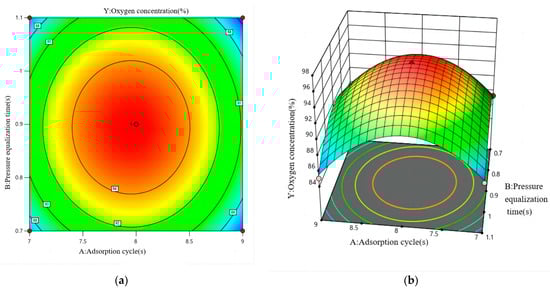 Contour (a) and response surface (b) of the oxygen concentration under the interaction between the adsorption cycle and pressure equalisation time.