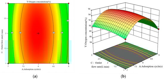 Contour (a) and response surface (b) of the oxygen concentration under the interaction between the adsorption cycle and outlet flow rate.