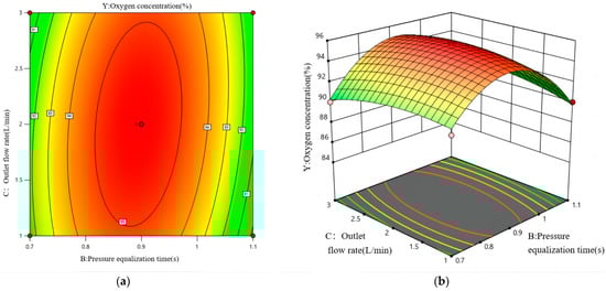 Contours (a) and response surfaces (b) of the oxygen concentration for the interaction between the pressure equalisation time and outlet flow rate.