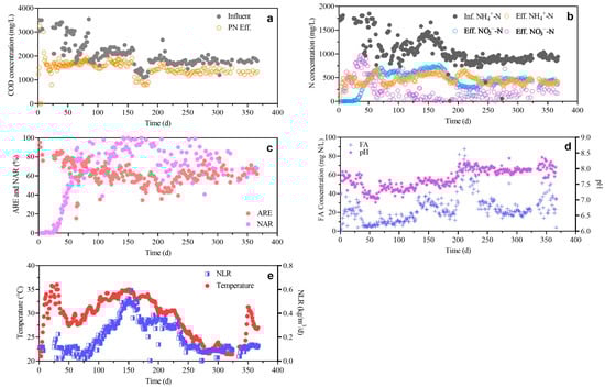 The performance of the PN process. COD concentration in the influent and effluent (a). Influent ammonia nitrogen concentration and effluent ammonia nitrogen, nitrite, and nitrate concentrations (b). Ammonia nitrogen removal efficiency (ARE) and nitrite accumulation ratio (NAR) (c). The free ammonia (FA) concentration and pH (d). The nitrogen-loading rate (NLR) and temperature (e).
