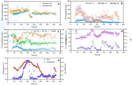 The performance of anammox process. COD concentration in the influent and effluent (a). Effluent ammonia nitrogen, nitrite, and nitrate concentrations (b). Influent and effluent total nitrogen (TN) concentrations (c). The free ammonia (FA) concentration and pH (d). The nitrogen-loading rate (NLR) and temperature (e).