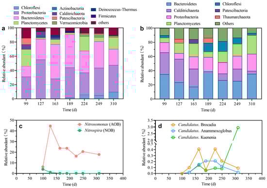 A total of 12 biomass samples were collected (six from the PN reactor and six from the anammox reactor) at different time points (Day 99, Day 127, Day 163, Day 189, Day 224, Day 249, and Day 310) for microbial community composition analysis using 16S rRNA gene amplicon sequencing. Good’s coverage value was 0.999, indicating sufficient library sizes. Figure 3 displays the top five phyla at each sample of the PN reactor, representing more than 90% of the reads. Proteobacteria dominated on Day 99, accounting for 31.2%, followed by Planctomycetes (23.5%), Bacteroidetes (14.9%), Patescibacteria (8.9%), and Calditrichaeota (6.9%) (Figure 3a). The composition of these main phyla remained relatively stable over the 367 days of operation, with Proteobacteria and Bacteroidetes consistently ranking in the top three, representing over 60% of total reads.