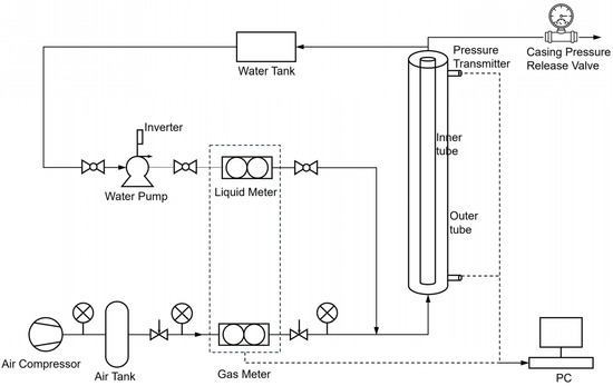 The experimental simulation device consists of four parts: gas injection system, water injection system, pipeline system, and monitoring system. Detailed experimental devices include water tank, water pump, liquid meter, air compressor, inverter, gas tank, gas meter, gas–liquid mixer, pressure transmitters, constant pressure release valve, plexiglass wellbore section, and measurement control system.