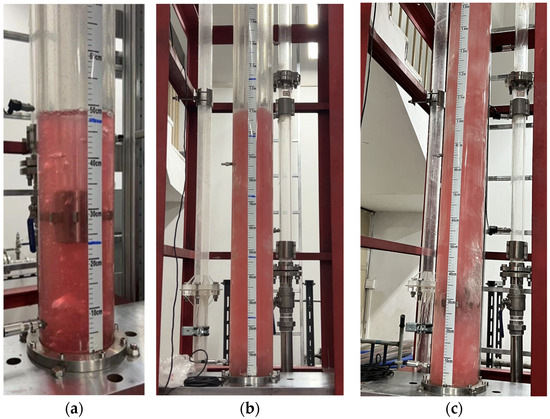 During the simulated experiments, the CPRV at the wellhead was initially closed, and water was injected into the bottom of the annulus until the water level reached the specified initial liquid column height. Subsequently, the water supply was stopped. A single-flow valve was installed at the inlet to prevent backflow. Gas was then injected into the bottom of the annulus at a predetermined rate. As the pressure in the annulus gradually increased due to the closure of the CPRV, the valve was opened when the pressure reached the specified casing pressure, stabilizing the pressure at the designated value. The flow patterns and fluctuations of the liquid level in the annulus were observed through transparent glass pipes.