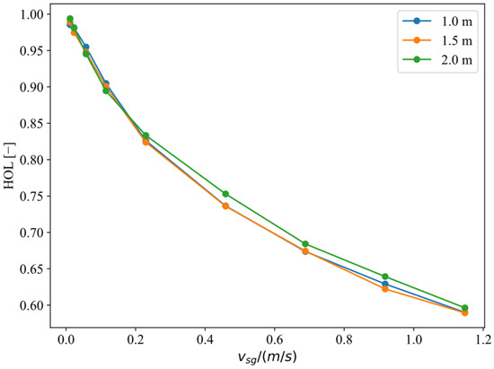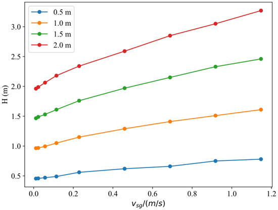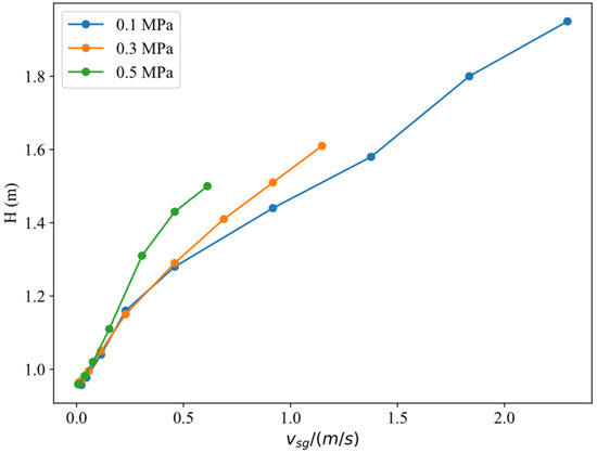 Figure 4 shows the change in liquid column height with vsg under different casing pressures, with an initial liquid column height of 1 m. It is evident that under the same gas velocity, higher casing pressure results in a higher dynamic liquid level. Increased casing pressure compresses the gas inside the annulus, causing the liquid level to rise to maintain balance between gas and liquid pressures [25,26].