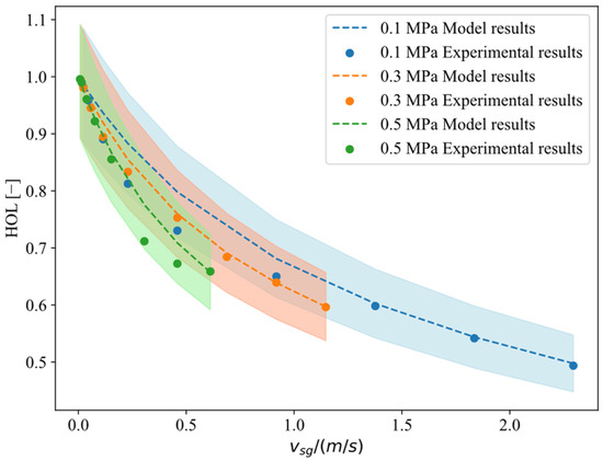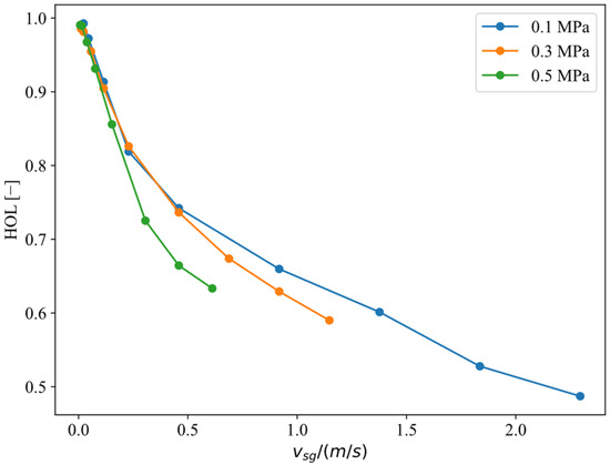 Figure 6 depicts the variation in holdup with vsg for different casing pressures when the initial liquid column height is 1 m. It can be observed that under the same gas velocity, a higher wellhead casing pressure leads to a lower holdup. This indicates that higher casing pressure compresses the gas inside the annulus, causing the liquid level to rise, thus resulting in a reduction in the cross-sectional holdup [27].