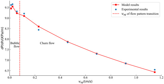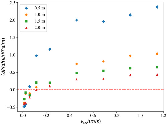 Figure 8 depicts the relationship between the frictional pressure gradient and vsg under different initial liquid-level heights when the casing pressure is 0.3 MPa. It can be observed that the frictional pressure gradient increases with increasing vsg. In addition, it can be found that the frictional pressure gradient decreases with the increase in the height of the liquid column at the same vsg. This is because when the height of the liquid level is lower, the resistance that the gas can overcome to pass through the liquid column is smaller, which makes the friction between the gas–liquid mixed flow and the pipe greater.