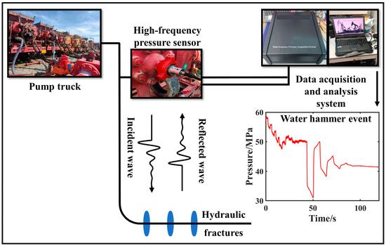 Water hammer fracture diagnosis is an easy-operation, economical, and real-time method for fracturing diagnosis. The water hammer wave is generated under the inertia. When the pumping fluid is stopped quickly, the sudden change in the flow rate causes water hammer pressure pulsation in the wellbore. The water hammer wave propagates along the wellbore, reflecting and carrying the downhole event information back to the wellhead when it encounters downhole events. A high-frequency sensor is installed at the wellbore to record the water hammer signal [27]. The sample rate is 1000 Hz, and the monitoring is carried out throughout the diversion. The configuration, including the high-frequency pressure sensor, data acquisition, and analysis system, is shown in Figure 1.