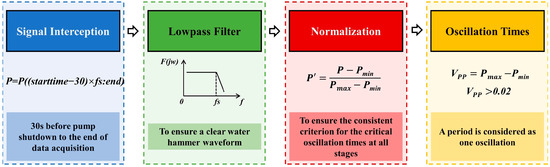 The feature extraction method for water hammer oscillation times described in this paper is as follows (shown in Figure 2): first, the water hammer signal is intercepted from 30 s before pump shutdown to the end of acquisition. Second, a lowpass filter is used for the intercepted signal to ensure a clear waveform. Third, mean normalization is used to eliminate the influence of the absolute treating pressure on the oscillation times, making a consistent criterion at each stage.