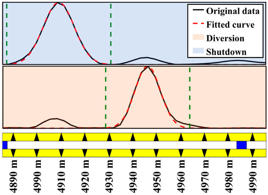 For example, for the events “Diversion” and “Shutdown” (see Figure 5), L1 = 4903 m, L2 = 4943 m, σ1 = 46 m, and σ2 = 37 m. The calculation of the probability of diversion based on depths and errors suggests that the diversion probability between “Diversion” and “Shutdown” is 97.83%.