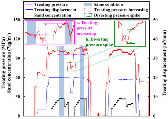 Additionally, it was observed in well 2 that the diversion performance of dual diversion was superior to that of single diversion, as evidenced by the higher probability of diversion, the higher treating pressure increase, and the higher diversion pressure spike. This may be attributed to the irregular size and shape of the spherical and powdered diverter, which can more effectively adapt to the fracture apertures of different sizes and shapes during diversion. Consequently, a stronger plugging effect and superposition effect are shown in dual diversion.