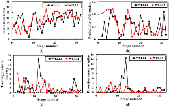 Firstly, the water hammer oscillation time dataset was quantified using the feature extraction method for oscillation times (Equations (1)–(4)), as shown in Figure 7a. The average oscillation times of well 1 and well 2 were 17.19 and 18.35, respectively. The oscillation time ranged from 2 to 27 in well 1 and from 2 to 28 in well 2. The 95% confidence intervals of the dataset mean, estimated using the normal distribution hypothesis [28], were [14.81, 19.56] and [15.92, 20.79], respectively. Secondly, the probability of diversion was calculated using the cepstrum analysis and error function (Equations (5)–(9)) as shown in Figure 7b. The average probabilities of diversion for well 1 and well 2 were 0.43 and 0.45, respectively. The 95% confidence intervals for the dataset means, estimated using the normal distribution hypothesis, were [0.33, 0.53] for well 1 and [0.34, 0.56] for well 2, respectively. Thirdly, the increases in the treating pressure and diversion pressure spikes were calculated using the treating pressure curve analysis (see Figure 7c,d). The average increases in the treating pressure for well 1 and well 2 were 2.21 and 1.71, respectively. The 95% confidence intervals for the dataset means, estimated using the normal distribution hypothesis, were [0.97, 3.45] for well 1 and [0.92, 2.45] for well 2, respectively. The average increases in the diversion pressure spikes for well 1 and well 2 were 1.37 and 0.87, respectively. The 95% confidence intervals for the dataset means, estimated using the normal distribution hypothesis, were [0.32, 2.41] for well 1 and [0.43, 1.30] for well 2, respectively. The results indicated that the average probability of diversion of well 1 and well 2 was similar, whereas the increases in the treating pressure and diversion pressure spikes of well 1 were higher than those of well 2. This discrepancy may be attributed to the conic diverter’s superior effectiveness compared to the spherical and powdered diverter, resulting in a more effective diversion performance in well 1.