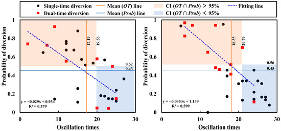 The water hammer oscillation times are plotted on the x-axis, with the corresponding probability of diversion on the y-axis. The relationship between the water hammer oscillation time and the probability of diversion is illustrated in Figure 8. The results indicate a negative correlation between the water hammer oscillation times and the probability of diversion; that is, lower oscillation times correspond to a higher probability of diversion. The fitting curves for the oscillation time versus the probability of diversion were determined to be y1 = −0.029x + 0.934 and y2 = −0.0353x + 1.139. The upper limit of the 95% confidence interval for the mean value of the dataset was calculated using the normal distribution hypothesis, as shown in the yellow area in Figure 8, while values below the 95% confidence level are represented in the blue area. The results indicate that when the oscillation time is greater than 20.79, the upper limit of the 95% confidence interval for the mean value of the dataset is reached, and the points are more likely to fall in the yellow area, indicating a higher probability of diversion. On the contrary, when the oscillation times is less than 20.79, the points are more likely to fall in the blue area, indicating a lower probability of diversion. Additionally, fewer oscillation times correspond to a higher probability of diversion. This may be due to changes in the main fluid acceptance zone between pre- and post-diversion.
