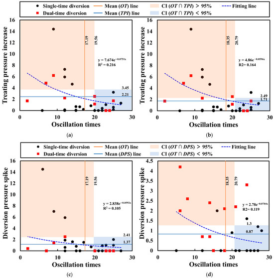 The water hammer oscillation times are plotted on the x-axis, with the corresponding treating pressure increases and diversion pressure spike on the y-axes, respectively. The relationship between the water hammer oscillation time and the treating pressure increase is shown in Figure 9a,b, while the relationship between the water hammer oscillation time and diversion pressure spike is shown in Figure 9c,d. The results indicate a negative correlation between water hammer oscillation times and the treating pressure response; the lower the oscillation time is, the higher the treating pressure increase and diversion pressure spike are. The fitting curves of the oscillation time versus the treating pressure increase were calculated as y1 = 7.674e−0.0751x and y2 = 4.86e−0.0596x, and the fitting curves of the oscillation time versus the diversion pressure spike were calculated as y1 = 2.838e−0.0592x and y2 = 2.78e−0.0704x. The upper limit of the 95% confidence interval for the mean value of the oscillation time and treating pressure response is shown in the yellow area in Figure 9, while values below the 95% confidence level are represented in the blue area. The results indicate that when the oscillation time is greater than 20.79, the upper limit of the 95% confidence interval of the mean value of the dataset is reached, and the points are more likely to fall in the yellow area, indicating a higher treating pressure increase and diversion pressure spike, resulting in a more effective diversion performance. On the contrary, when the oscillation time is less than 20.79, the points are more likely to fall in the blue area, indicating a poorer diversion performance. In general, lower oscillation times correspond to higher magnitudes of treating pressure increase and diversion pressure spike, indicating a higher probability of effective diversion. This may be because the effective performance of the diverter increases the liquid flow resistance in the wellbore–fracture–reservoir, resulting in the treating pressure increasing and the diversion pressure rising rapidly and reaching a peak after diversion.