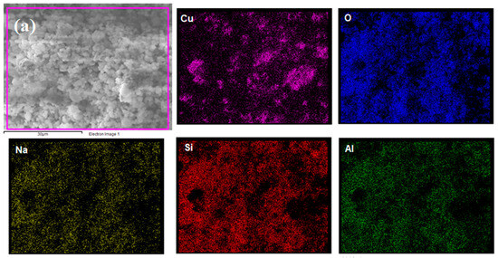 Elemental mapping was performed by EDS to identify chemical elements at the catalyst surface using a magnification of 4000×. Figure 2 shows that all proposed elements were detected, indicating the effectiveness of the proposed wet impregnation process. Additionally, Cu seemed to be better dispersed on NaY compared to Nb2O5/Al2O3, which presented higher Cu concentrations in some regions. This is strongly linked to the superior textural properties of the zeolite, which allowed for a better distribution of the metal particles.