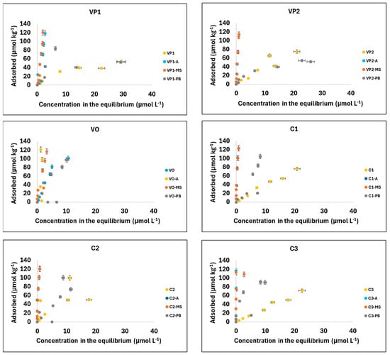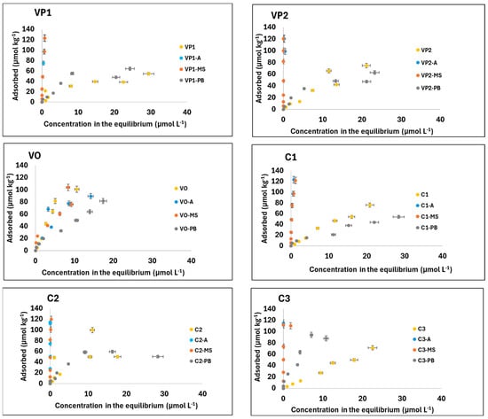 Adsorption curves for CFX corresponding to soils without and with bioadsorbents (amended at a dose of 48 t/ha). Average values (n = 3) are with coefficients of variation always lower than 5%. Bars indicate standard deviation. C = corn soils; VO and VP = vineyard soils; A = oak ash; MS = mussel shell; and PB = pine bark.