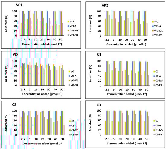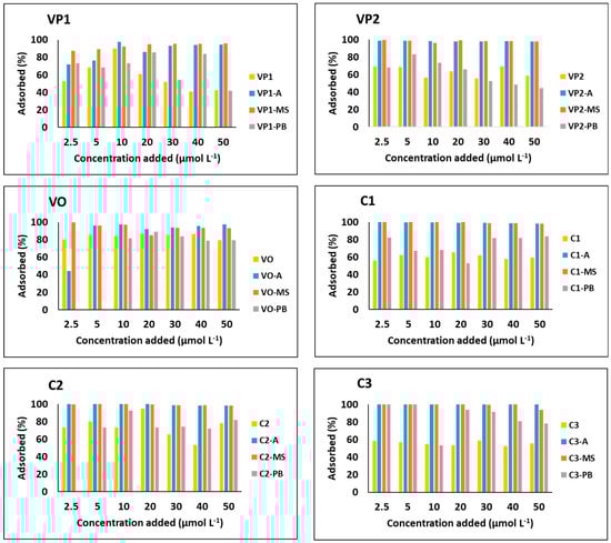 Adsorption of CFX (as a percentage) by soils without and with bioadsorbents amended at a dose of 48 t/ha as a function of the concentration of antibiotics added. Average values (n = 3) are with coefficients of variation always lower than 5%. C = corn soils; VO and VP = vineyard soils. A = oak ash; MS = mussel shell; and PB = pine bark.