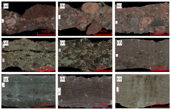 Lithological classification. (a) Conglomerate. (b) Cobble conglomerate. (c) Coarse to medium conglomerate. (d) Small to medium conglomerate. (e) Granule. (f) Gritstone. (g) Fine-medium sand. (h) Siltstone. (i) Mud.
