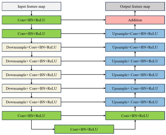 The gravel recognition process utilizes the SOD network U2-Net, which incorporates a two-level nested U-shaped network structure. Its core components are residual U-blocks designed to extract multi-scale contextual information from images. As shown in Figure 2, this module primarily consists of three parts: an ordinary convolutional layer for extracting local features, a symmetric encoder–decoder structure similar to U-Net for extracting and encoding multi-scale contextual information, and a residual connection structure that sums the fused local features and multi-scale features to produce the final feature map. The number of layers in the RSU residual blocks can be adjusted based on the resolution of the input feature maps at each layer.