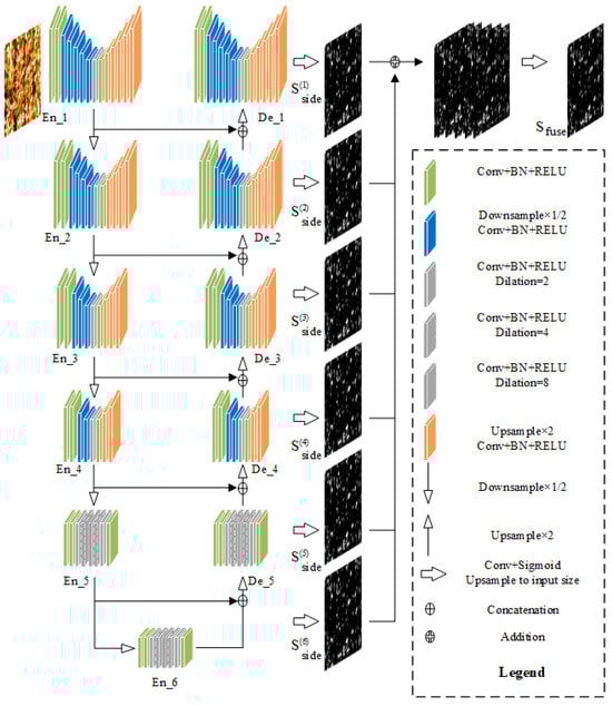 where (m is the number of layers) is the loss of each significance probability map (Figure 3), is the loss of the final fused significance probability map, and and are the weight of losses for each stage. Among them, the cross entropy was used to calculate the loss :