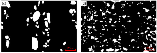 Before original maps and labels of different types of gravel formation: (a) low gravel content; (b) high gravel content; (c) the image label of low gravel content; (d) the image label of high gravel content.