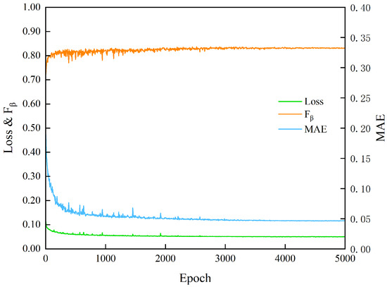As shown in Figure 6, the training loss decreases to below 0.06 at the early stage and stabilizes after 2700 training times. The F-measure rises to 0.820 at the early stage and gradually stabilizes after 3000 training times, reaching a maximum of 0.837. The MAE rapidly decreases at the early stage with significant fluctuations and tends to stabilize after 2700 training times. The corresponding MAE at the highest F-measure is 0.048.